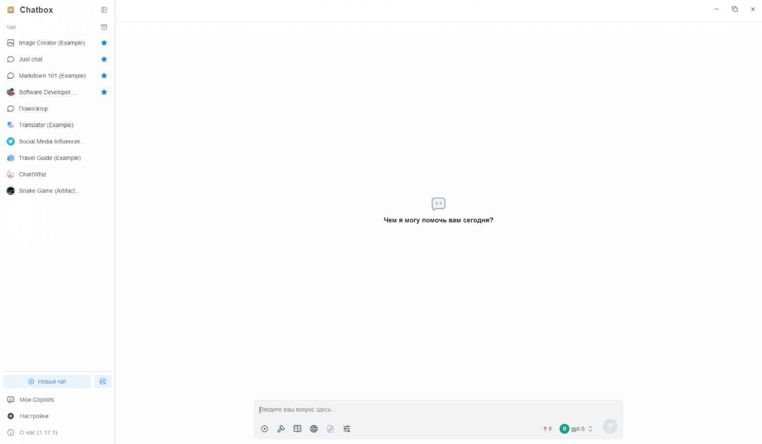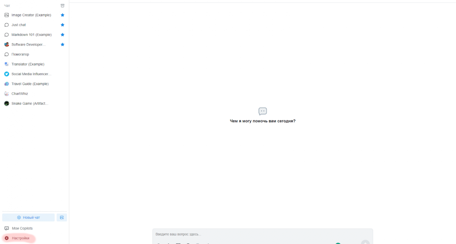 Закрываем настройки и приступаем к использованию приложения. В левом боковом меню можно зайти в уже готовый чат, посмотреть примеры или просто создать новый.