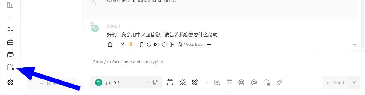 Кликните на ▽ рядом с New prompt. (Если кнопку не видно, увеличьте окно Msty или разверните диалоговое окно на весь экран.)