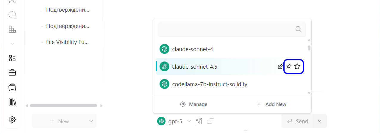 Закрываем настройки и возвращаемся в главное окно. В списке моделей можно закрепить любимые нейросети кнопкой ? Pin <...>. А можно назначить модель по умолчанию (например, gpt-5) через ☆ Set <...> as default.