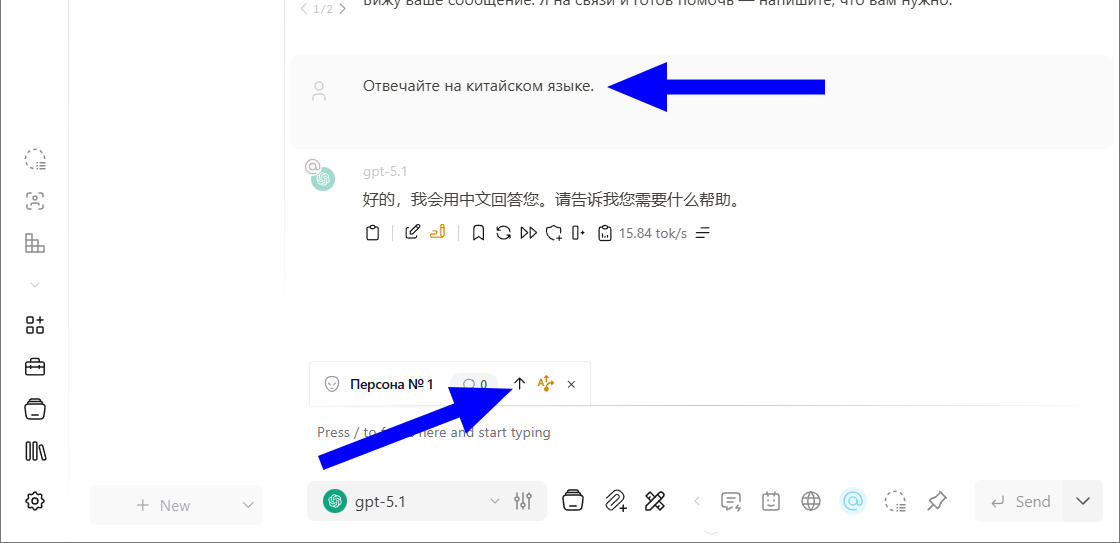 Персону можно «включать» не только кнопкой. Иногда удобнее просто отправить её системный промпт в чат как обычное сообщение. Для этого выберите персону, нажмите кнопку ↑ — и её системный промпт добавляется в диалог.