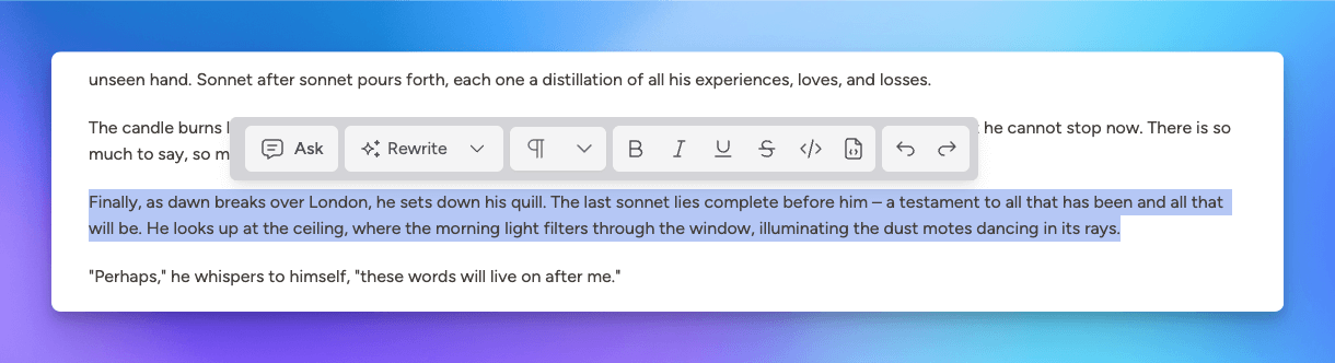 И отдельная кнопка Ask, которая позволяет применить ваш собственный промпт к выделенному фрагменту.