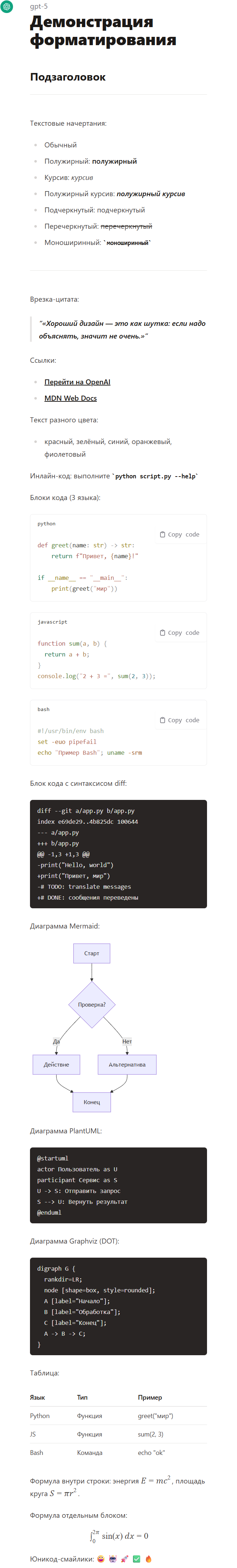 Если взглянуть на инструменты, доступные для сообщений от чат‑бота, то почти все они совпадают с теми, что есть у пользовательских сообщений. Но есть несколько особых кнопок, которые работают только для ответов модели: