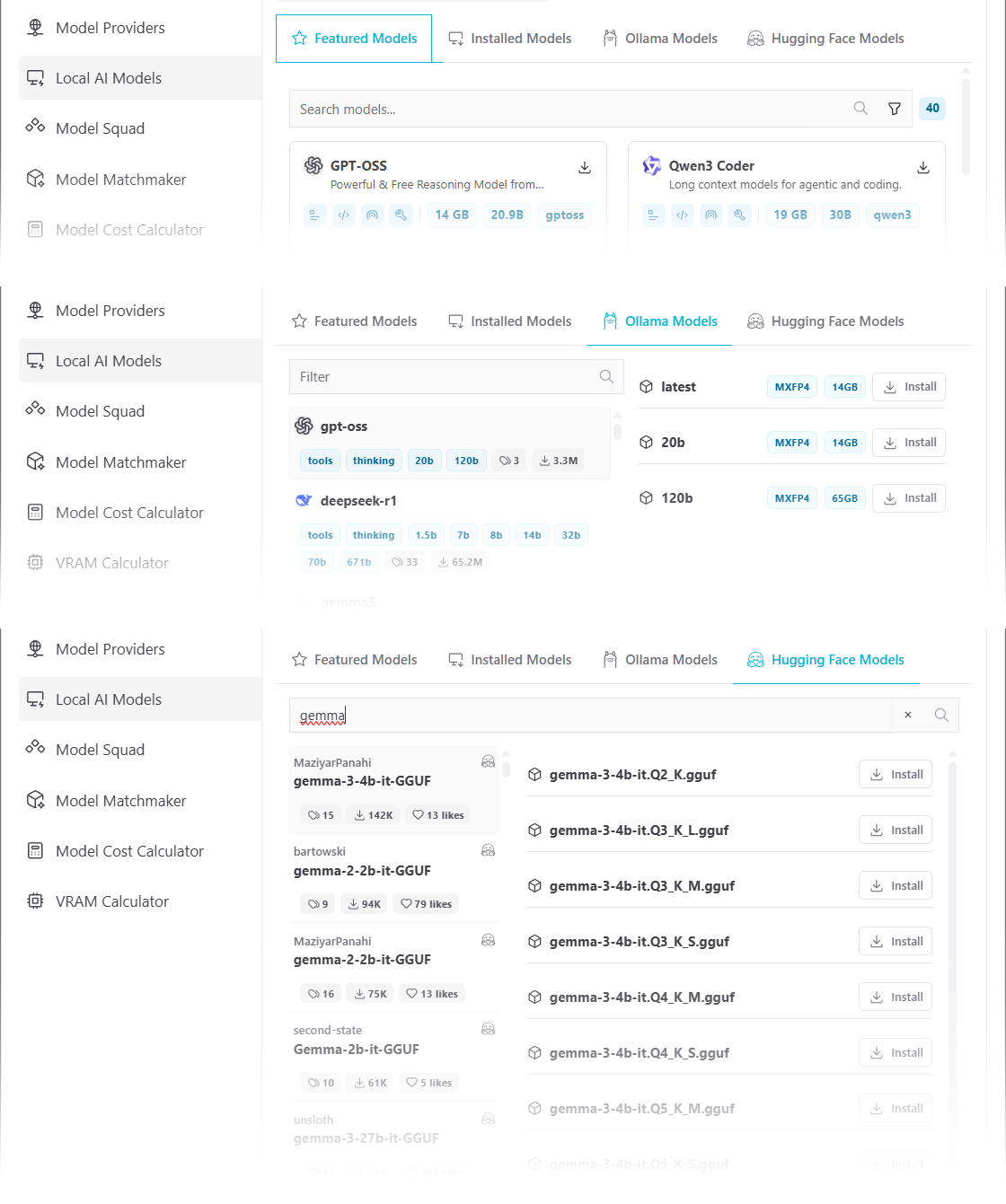 2. Выбирайте модели во вкладках Featured models, Ollama models и Hugging Face models.