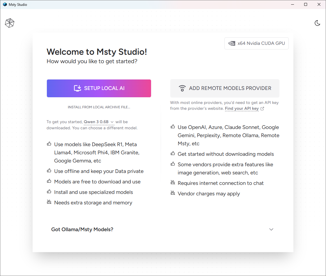 После первого запуска Msty встречает вас окном, где предлагает определиться, по какому пути вы пойдёте: