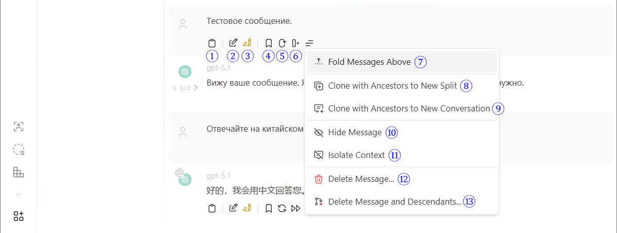 8. Clone with ancestors to new split — копирует весь диалог до текущего сообщения в новый сплит.