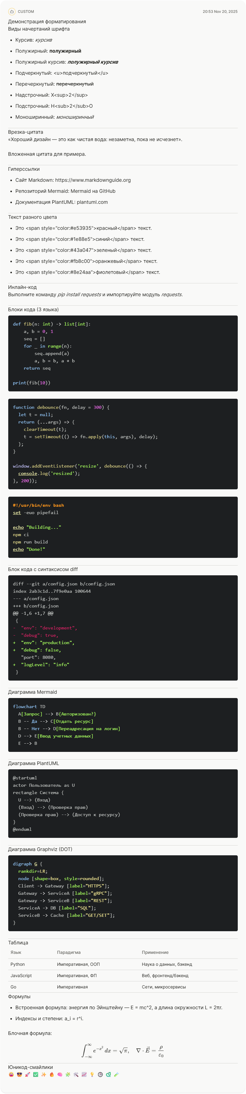Заголовки, подчёркнутый текст, инлайн‑код, цитаты — всё это выглядит абсолютно так же, как обычный текст. Никаких визуальных акцентов, будто Kaas решительно игнорирует тот факт, что такие элементы в ответах ИИ встречаются постоянно.