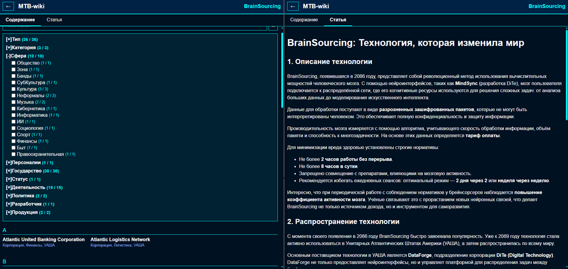 Вторым важным элементом проекта стала энциклопедия. Так как хотелось сделать мир побогаче, но при этом не перегружать основное повествование описаниями политики, экономики и особенностями технологий, было решено вынести всю эту информацию в энциклопедию, а в комиксе добавить ссылки на соответствующие статьи, если события или упоминания вызовут желание изучить что-то более детально.