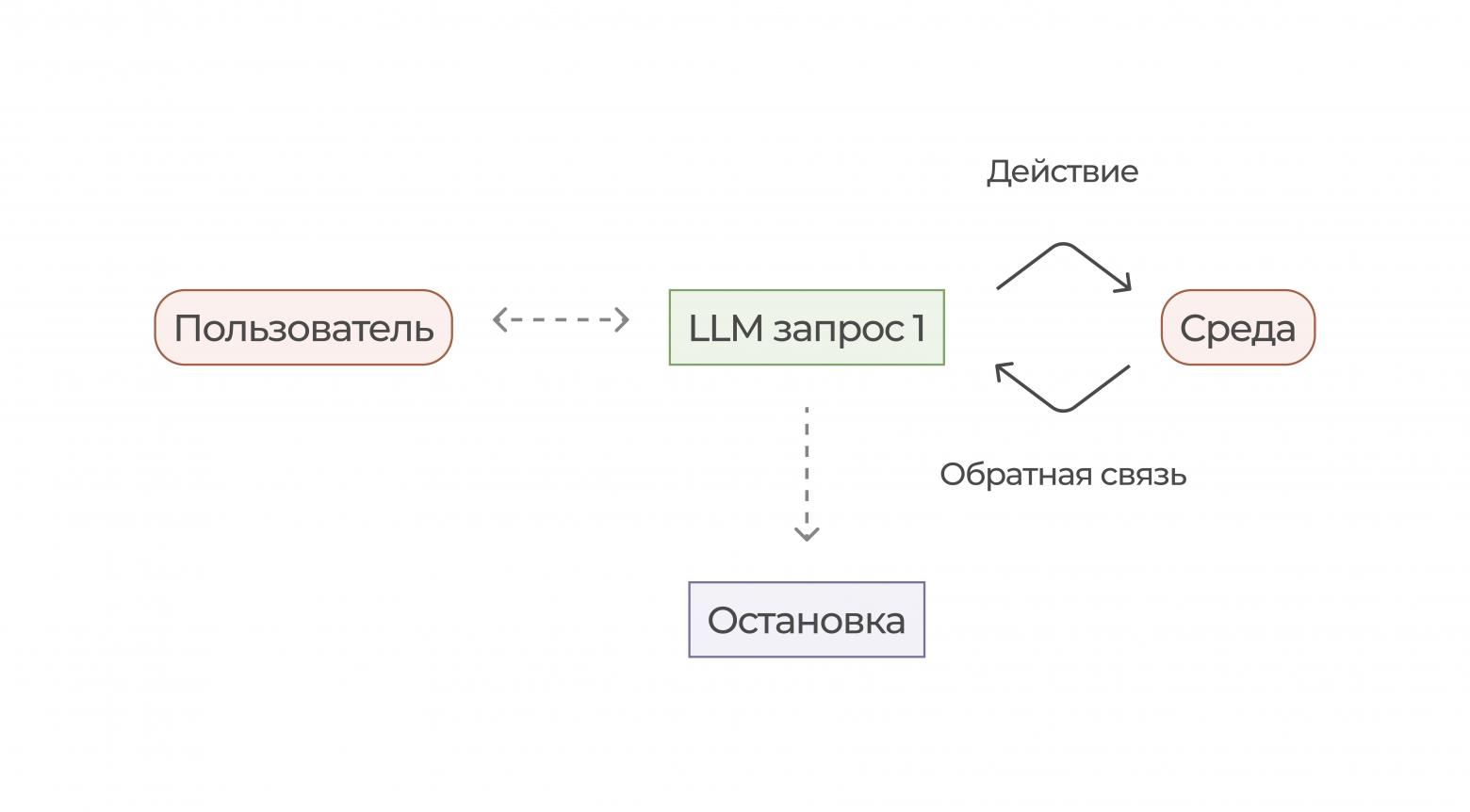 Человек делает определенный запрос в систему, в основе которой лежит LLM-движок. Для того чтобы выполнить запрос, агент взаимодействует с определенной средой. Если это агент, чья задача искать информацию - его средой будет интернет. Если агент пишет код, то есть вносит изменения в файлы, то его среда - файловая система. ИИ-агент будет обращаться к своей среде столько, сколько нужно, чтобы выполнить запрос.