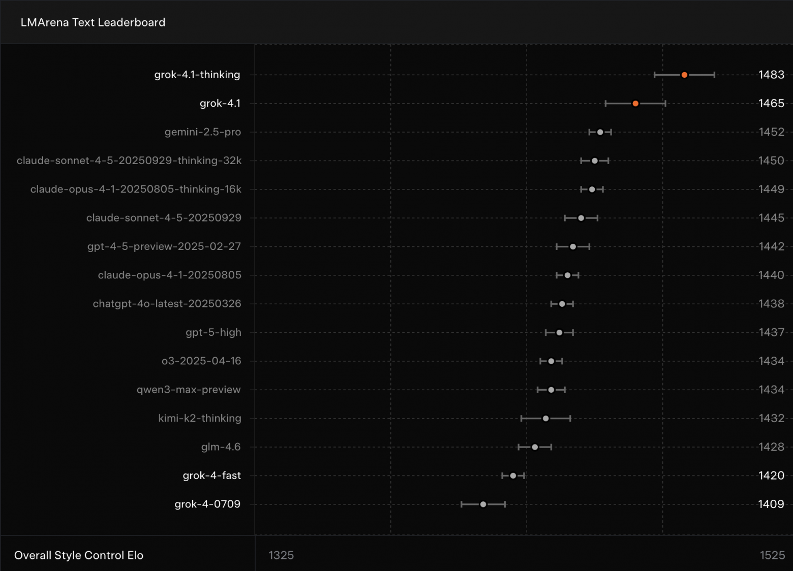 Text Arena проекта LMArena: Grok 4.1 Thinking и Fast заняли первое и второе места соответственно.