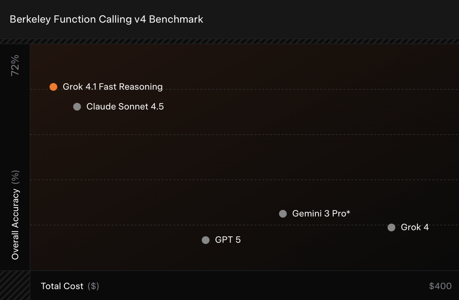 Berkeley Function Calling v4: точность 72% при невысокой стоимости выводит Grok 4.1 Fast в лидеры по качеству обычного и рассуждающего tool-calling.