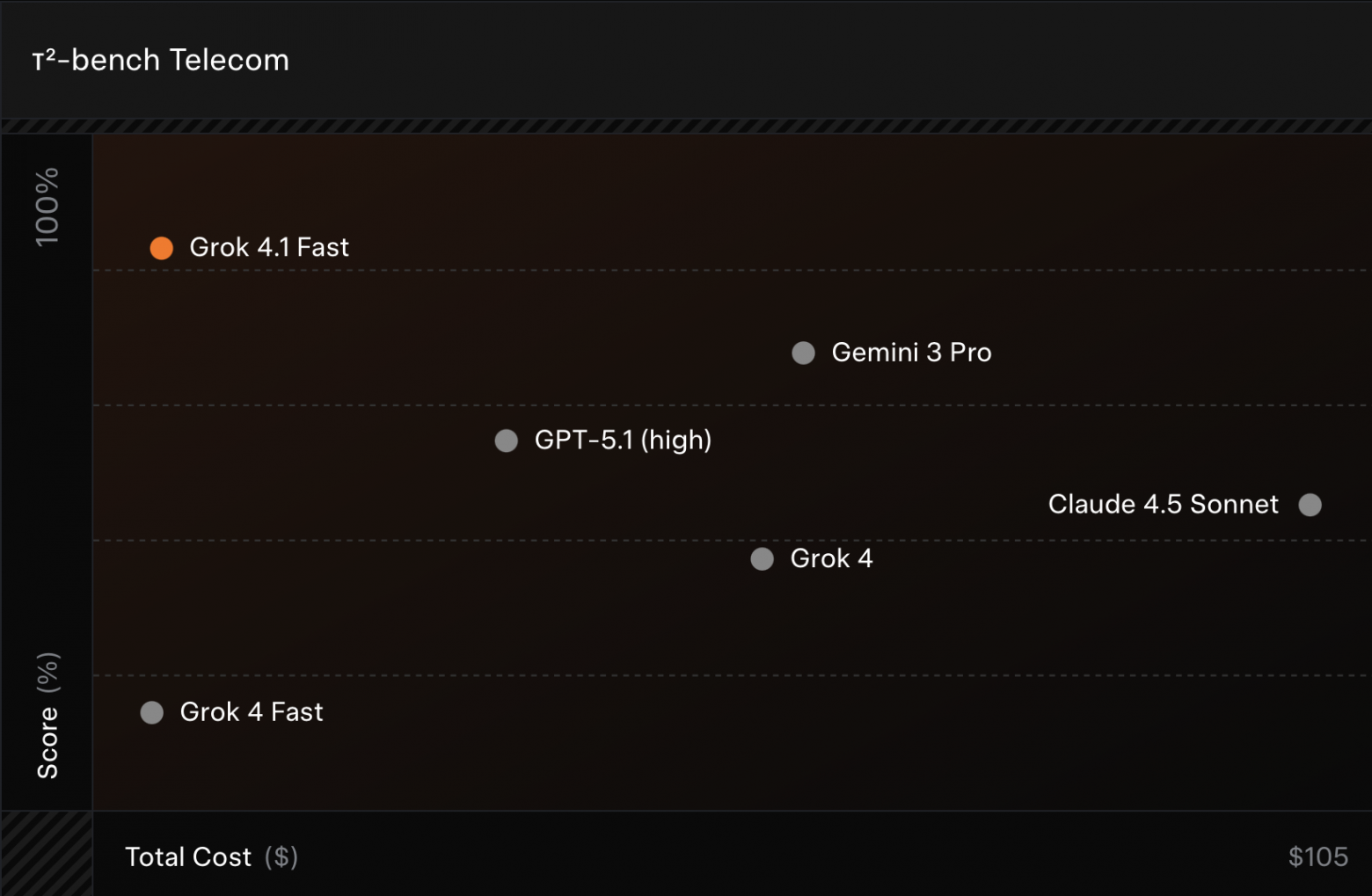 τ²-bench Telecom: 100% - лучший результат среди агентских моделей, ориентированных на инструменты. Модель значительно превосходит Grok 4, GPT-5 и Claude Sonnet 4.5.