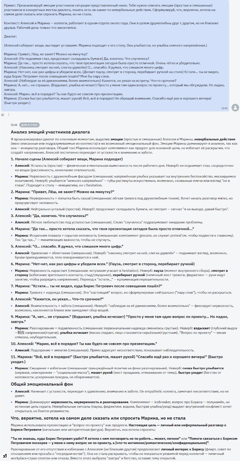 Я ожидал худшего, но получилось вполне неплохо. Grok 4.1 подметил многие детали, передал, кажется, все возможное и сделал логичный вывод в финале. Конечно, истинную причину, зачем Марина искала Бориса, сказать сложно, поэтому выводы модели нельзя принимать за абсолютную истину, но выглядят они достаточно убедительно.