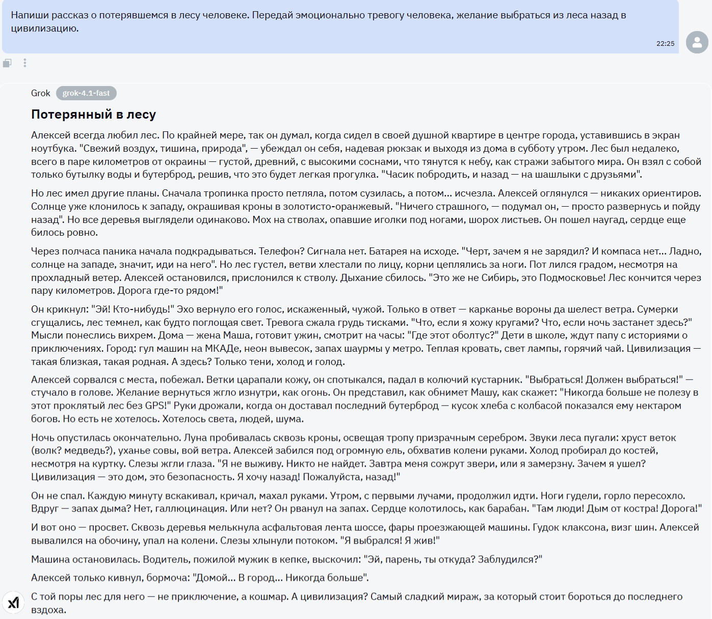 Итак, добиться чего-то путного в генерации стихотворения не удалось. Перейдем к другому тесту, тоже связанному с творчеством. Теперь я попрошу модель написать небольшой рассказ о человеке, потерявшемся в лесу. Пусть она попытается передать его тревогу и отчаянное желание выбраться.