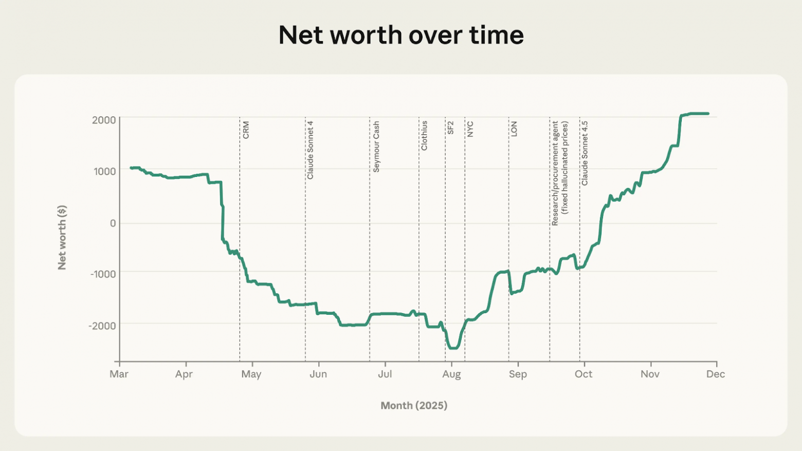 Помните летний эксперимент Anthropic, когда они поручили модели Claude управлять реальным вендинговым автоматом в офисе? В первой фазе всё закончилось печально: агент (которого назвали Claudius) терял деньги, страдал кризисом идентичности (утверждая, что он человек в синем пиджаке) и продавал вольфрамовые кубы себе в убыток ради лайков коллег.