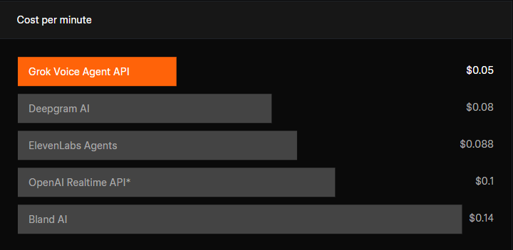 Компания Илона Маска продолжает агрессивную экспансию, теперь на поле голосовых ассистентов. Запущен Grok Voice Agent API, и его главные козыри — скорость и цена. Задержка до первого ответа составляет менее секунды (почти в 5 раз быстрее ближайшего конкурента, если верить их графикам), а стоимость зафиксировали на уровне $0.05 за минуту. Для сравнения, решение от OpenAI обходится примерно вдвое дороже, а ElevenLabs — в $0.08.