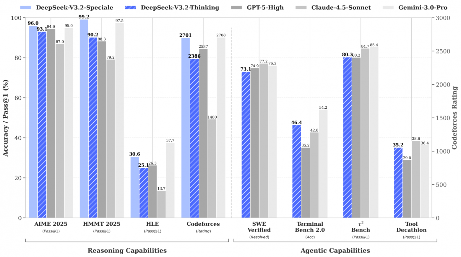 Китайская лаборатория DeepSeek продолжает играть Робин Гуда от мира ИИ, выкладывая state-of-the-art-решения в опенсорс (или предоставля очень дешевый доступ). В этот раз выпустили сразу две модели: сбалансированную DeepSeek-V3.2 и монструозную DeepSeek-V3.2-Speciale. Последняя — это настоящая вычислительная мощь, заточенная под сложнейший ризонинг. Speciale оперативно забрала «золото» на международных олимпиадах IMO 2025 (математика), IOI 2025 (информатика) и ICPC WF 2025, обойдя по метрикам GPT-5 и вплотную приблизившись к Gemini 3.0 Pro.
