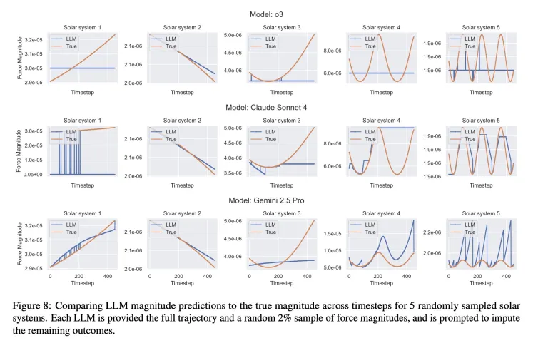 Когда большим языковым моделям o3, Claude Sonnet 4 и Gemini 2.5 Pro задали реконструировать законы тяготения для различных сымитированных «солнечных систем», ни одна из них не предложила ничего похожего на сформулированный Ньютоном закон всемирного тяготения — несмотря на то, что сами эти БЯМ обучались именно на законах Ньютона. Это ярко демонстрирует, насколько сильно БЯМ полагаются на сопоставление с шаблоном, а сами не в состоянии прийти даже к элементарным релевантным научным выводам об основополагающих моделях.
