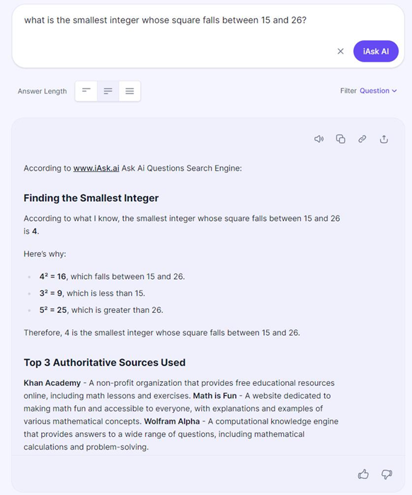 Скриншот вопроса о целых числах, заданного модели iask.ai, а также её удручающе неверный ответ. Правильный ответ — -5. Чтобы получить его, нужно ещё несколько промптов, которыми мы сами целенаправленно подводим ИИ к верному выводу.