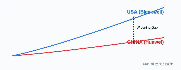 У Китая есть чипы Huawei, приличные по сравнению с устаревшими поколениями Nvidia. Они заставляют китайский ИИ переходить на отечественные ускорители. Но Blackwell уже здесь, и разрыв в производительности вот-вот взорвется.