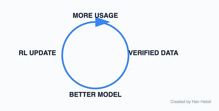 Рассуждающие модели все изменили. Теперь есть маховик: пользователи взаимодействуют, предпочтения создают верифицируемый обучающий сигнал, сигнал улучшает модель, привлекает больше пользователей. Та же динамика возрастающей отдачи, что сделала доминирующими Netflix и Amazon.