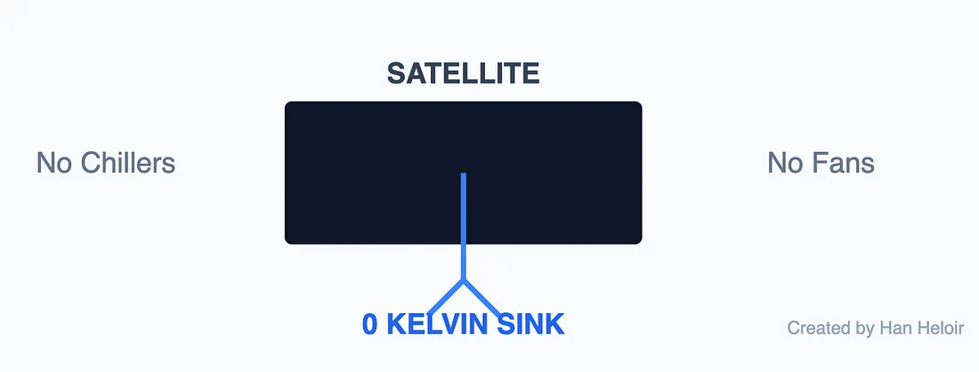 Охлаждение в космосе бесплатно. Поставьте радиатор на темной стороне спутника. Температура приближается к абсолютному нулю. Отвод тепла не требует активных систем, охлаждающей жидкости, электричества для вентиляторов.