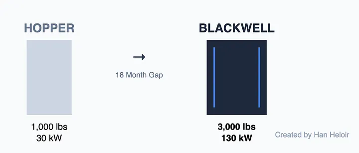 Переход: от воздушного охлаждения к жидкостному, от 450 до 1360 килограммов, от 30 до 130 киловатт на стойку. Представьте, что для обновления iPhone вам нужно перевести дом на 220 вольт, установить Powerwall, добавить генератор, развернуть солнечные панели и укрепить полы. Это и есть Blackwell.