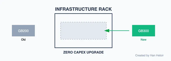 GB300 (Blackwell второго поколения) - лучший чип с улучшенными характеристиками. Ключевой момент: полностью совместим со стойками GB200. Любой дата-центр, справившийся с GB200 - уже решивший вопросы питания, охлаждения, укрепления полов - может просто вставить GB300.