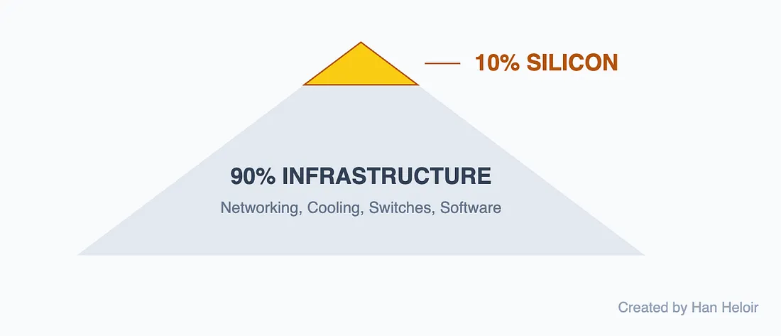 Что все узнают на горьком опыте: разработка хорошего ИИ-чипа - это 10% задачи. Вам также нужны сетевая карта, CPU, коммутатор для scale-up, протокол scale-up, коммутатор для scale-out, кабели, охлаждение, программный стек, который все это связывает.