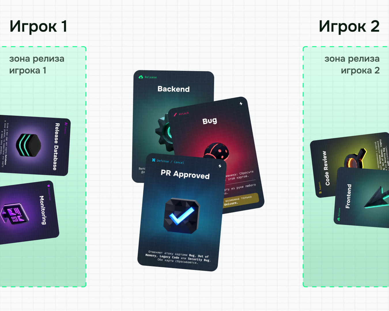 Баги и фиксы — это классика разработки, но никто не делает баги специально. Как правило, проблемы находят коллеги, тестировщики, либо они возникают уже на проде. В игре баги подкидывают соперники в момент релиза, и для успешного релиза нужно их пофиксить. Чтобы не привязывать баги только к релизам, их можно подкидывать свободно в процессе игры, чтобы, например, стащить карту из руки соперника.