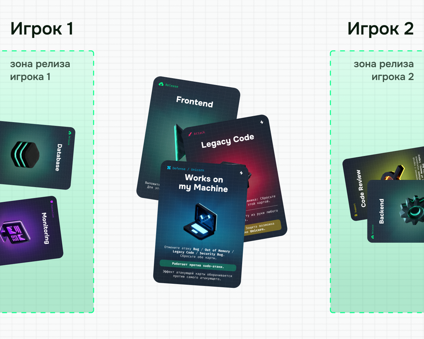 Цель игры — зарелизить карты Frontend, Backend и Database на столе перед собой.