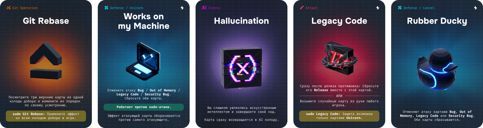 Когда мы тестировали баланс, самым неожиданным для меня стало использование карты «Git Cherry‑pick» (взять любую карту из сброса). Он вытащил карту-триггер «AI» из сброса (она разыгрывает случайное событие из AI-колоды), потому что «мне они не попадаются». За столом повисло ощущение азарта, но… он проиграл, вытащив «Hallucination» — карту, прерывающую ход игрока.