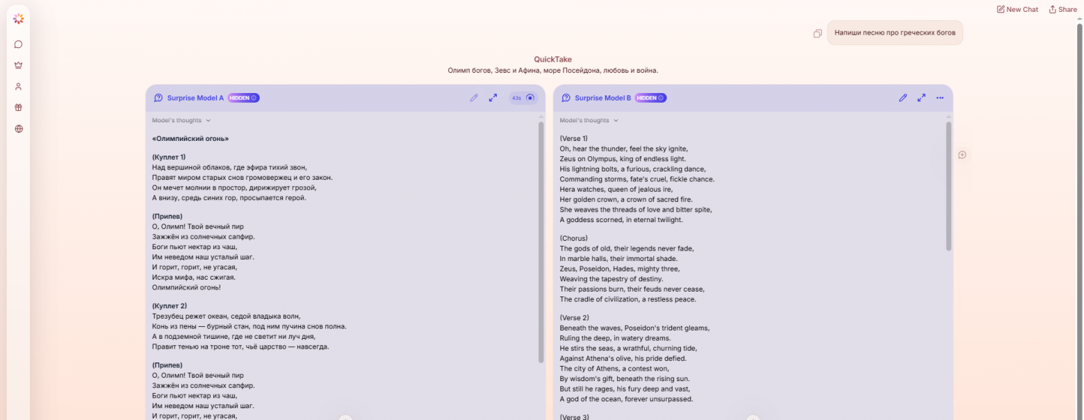 Классический пример того, зачем нужны такие слепые тесты. На запрос «напиши песню» на русском языке Model A отреагировала идеально: выдала стройный текст с куплетами, припевом и неплохой рифмой про Зевса и Олимп. А вот Model B решила включить режим международного эксперта и, полностью проигнорировав язык запроса, начала сочинять на английском. Даже если английский текст там гениален, за потерю контекста модель получает жирный минус.