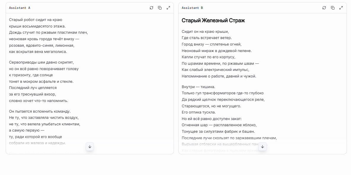 В творческом спарринге победа безоговорочно уходит левому углу (Assistant A). Задача была написать верлибр — белый стих без рифмы, где на первом месте стоят образы и атмосфера. Модель А справилась филигранно, выдав густой киберпанк-нуар с «неоновой кровью города» и действительно мощной концовкой про «железо и надежду». Assistant B же, напротив, не удержался и скатился в примитивное рифмоплетство (крыши - ветер), нарушив условие задачи и превратив глубокую сцену в банальный стишок. Это отличный пример того, как более продвинутая модель чувствует стиль и контекст, в то время как её оппонент просто следует жесткому шаблону «попросили стих - значит, буду рифмовать».