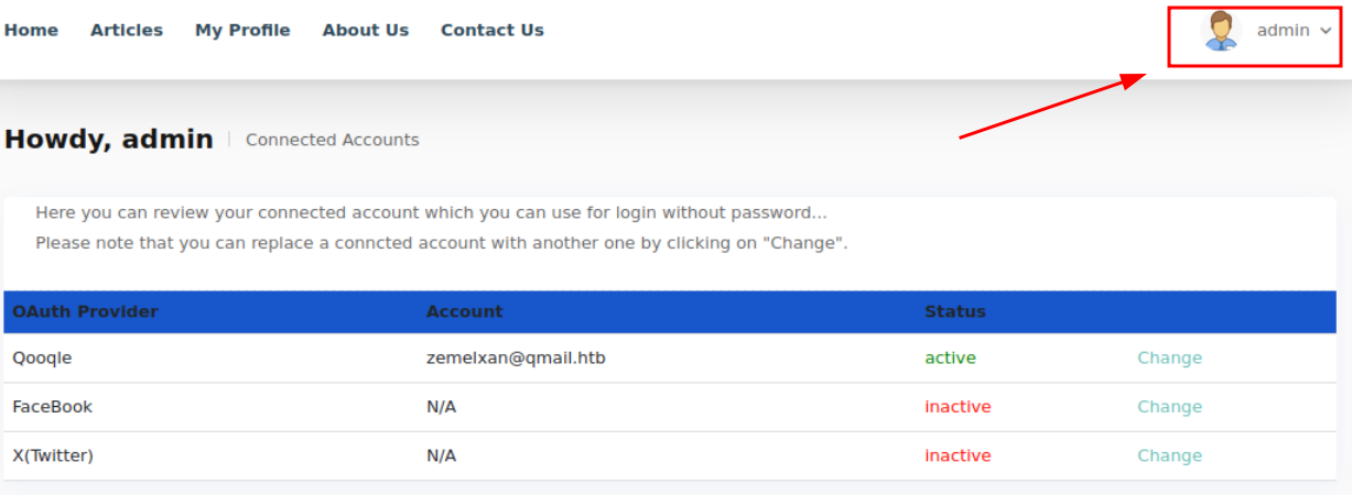 Создадим такой Article (http://eloquia.htb/article/create/), который будет перенаправлять админа с нашим кодом и свяжем нашу учетку на Qooqle с учеткой админа на Eloquia. Затем попросту залогинемся на Eqloqui через OAuth, используя Qooqle и получим права админа.