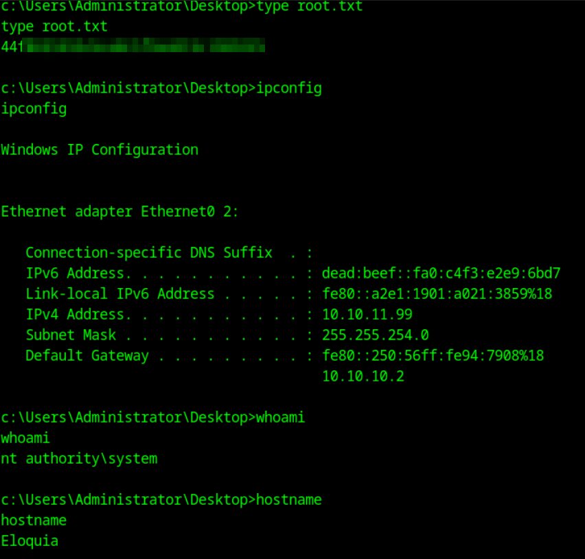 Ура! Вы должны получить права SYSTEM и можете прочитать флаг.