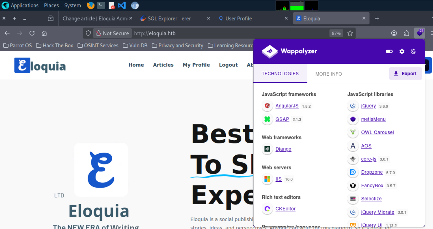 Изучая функционал админки, находим SQL Explorer (http://eloquia.htb/dev/sql-explorer), который реально выполняет команды на продуктовой БД в бэке: