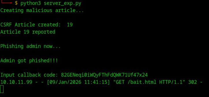 Заметим, что есть кнопка Report (http://eloquia.htb/article/visit/<Article ID>/) и будет логично, если админ проверяет все репорты. Там мы его и поймаем на удочку.