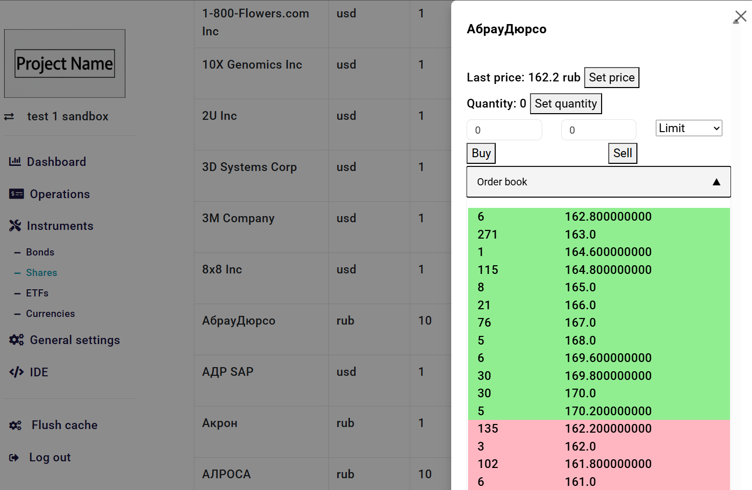 возможность выставления заявки на покупку/продажу с выбором типа заявки (лимитная, рыночная, лучшая цена)