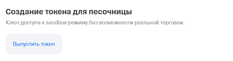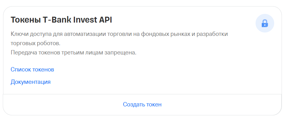 Перейдем к получению ключа. Для этого открываем страницу настроек инвестиций https://www.tbank.ru/invest/settings/ и в самом низу находим кнопку для создания нового токена.