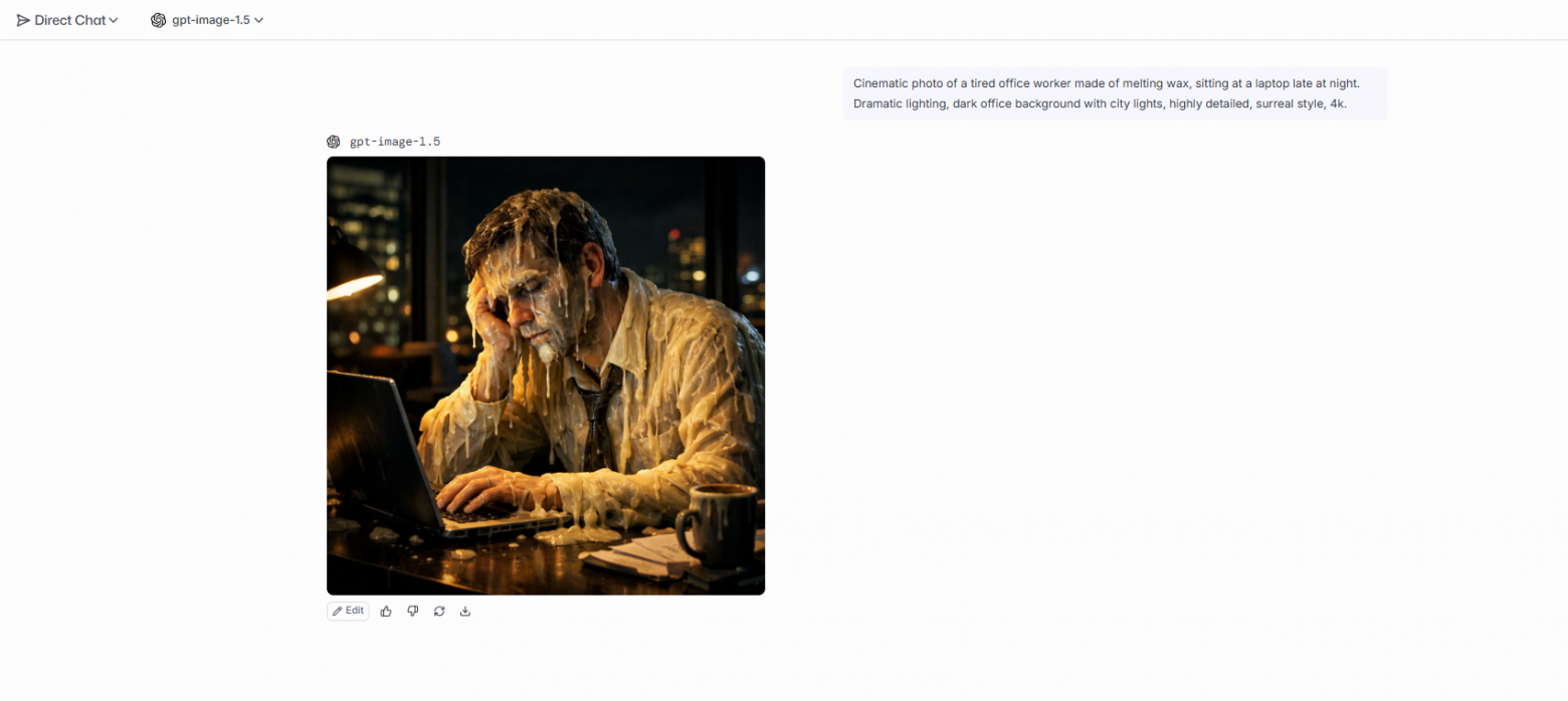 Результат пугающе правдоподобен. Если вам нужно визуальное определение состояния «вечер пятницы, дедлайн через час», то вы его нашли. Мы прогнали промпт через GPT-Image-1.5, и нейросеть честно расплавила анатомию: рубашка стекает вместе с кожей, свет падает кинематографично, и выглядит это как кадр из дорогого хоррора про офисные будни. Для бесплатного инструмента, который запускается прямо в браузере без всяких кредитов, уровень детализации зашкаливает.