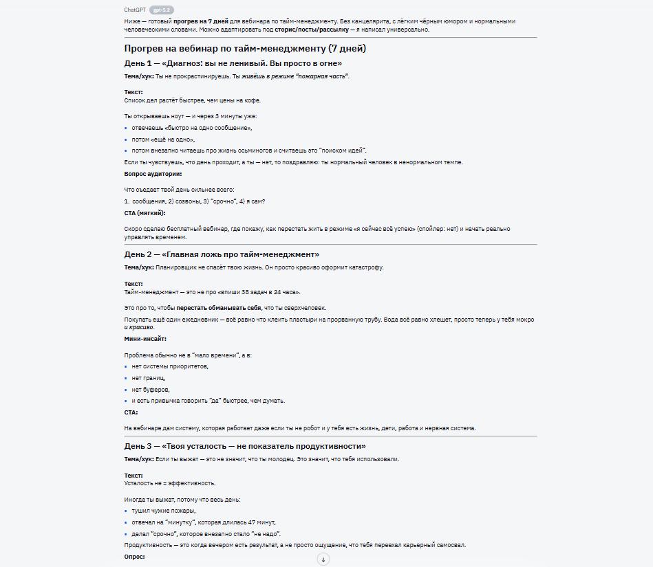 На тесте мы попросили нейросеть написать прогрев без банальностей, и она справилась вполне сносно. Настройки тональности действительно меняют стиль. Вместо сухих фактов бот выдал рабочую метафору про планировщик, который красиво оформит катастрофу. Разумеется, это всё ещё черновик - текст требует вычитки, а местами и переписывания, чтобы убрать неестественные обороты. Но главную проблему чистого листа инструмент решает: выдает крепкую структуру и пару идей, которые остаётся просто докрутить руками.