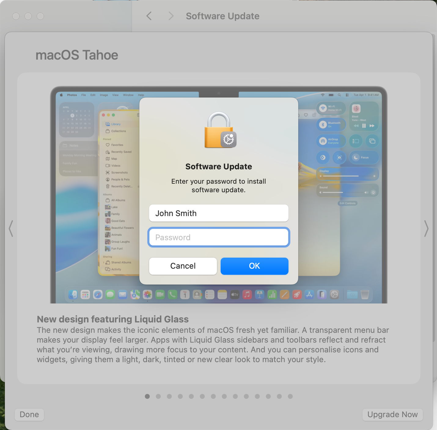 В течение последних трех лет при переходе на Ventura, Sonoma, Sequoia и теперь Tahoe Apple по возможности выполняет апгрейды macOS не через полноценный установщик, а так же как и обычные обновления. Такой подход заметно быстрее: данных нужно скачать меньше, их не приходится долго распаковывать и устанавливать. При этом Apple по-прежнему утверждает, что «перед началом установки система запрашивает пароль администратора». На практике это уже не соответствует действительности, даже на Mac с Apple Silicon.