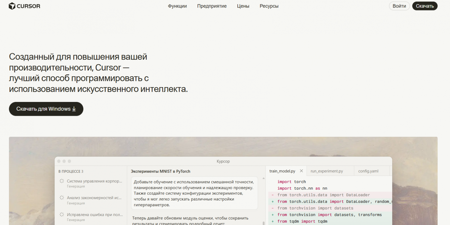 На седьмом месте рейтинга Cursor. Это решение для другой, не менее важной аудитории: разработчиков и технических специалистов. Если вы проектируете интерфейс для нового продукта, создаете прототип веб-приложения или автоматизируете внутренние процессы, Cursor станет вашим союзником. Это интеллектуальная среда разработки, созданная на базе популярного VS Code, которая встроила мощный ИИ непосредственно в ваш рабочий процесс.