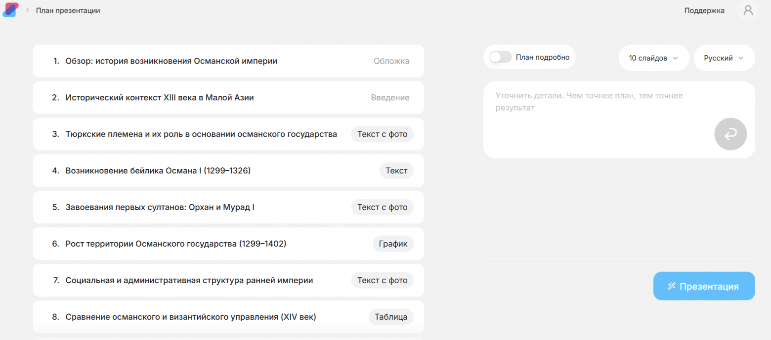 Главная фишка Сократика - скорость и фокус на сути. Вам не нужно разбираться в десятке настроек. Просто заходите на сайт, вбиваете тему презентации, выбираете количество слайдов, дизайн, и через минуту ИИ уже показывает вам готовый план. Да-да, не сами слайды, а сначала план. Это гениально просто, вы можете сразу убрать лишнее, добавить свой пункт или поменять порядок, и только потом нейросеть создаст полноценные слайды. Это спасает от ситуации «ой, все не так, переделывай».