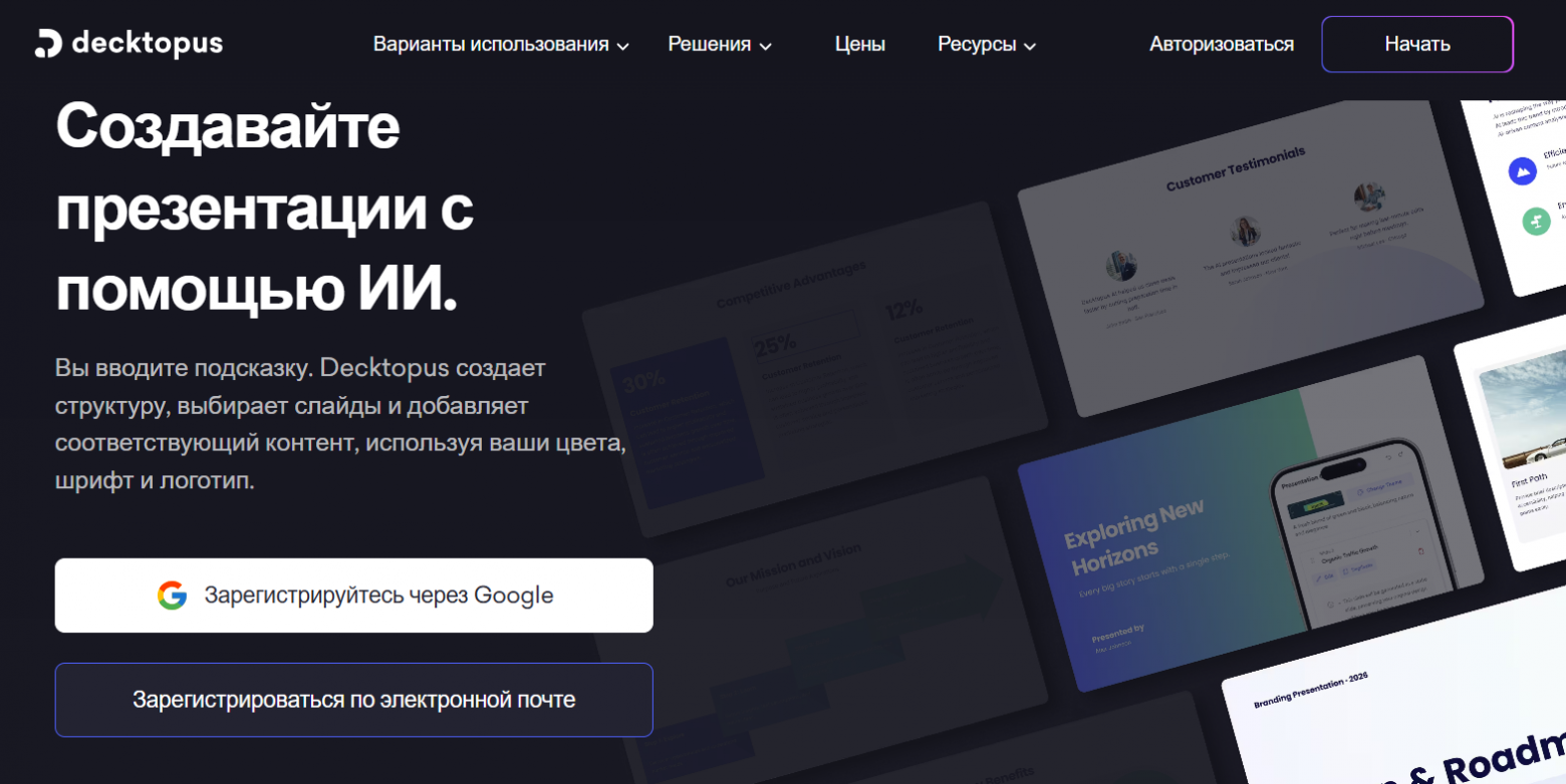 Главной особенностью Decktopus является его комплексный подход. Вы вводите запрос на нужную тему, а сервис не только выстраивает структуру и подбирает дизайн, но и помогает рассказать эту историю вслух.