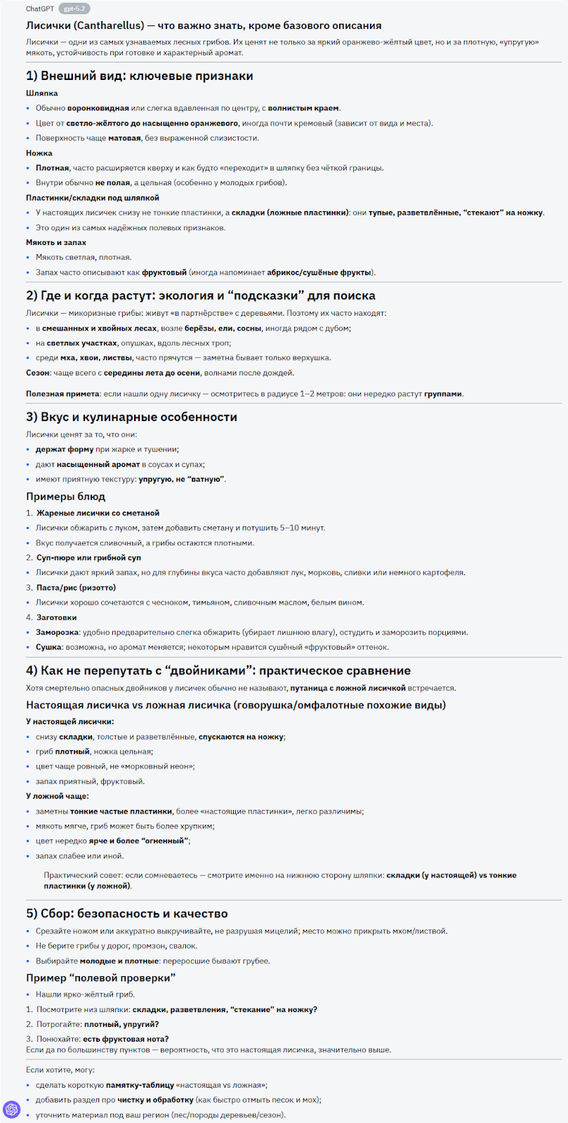 Лисички - яркие грибы с оранжево-желтой шляпкой и тонкой ножкой. Они растут в лесах, чаще всего на светлых участках среди мха и листвы. Лисички съедобны, имеют приятный аромат и слегка фруктовый вкус. Их часто собирают для супов, жарки и заготовок на зиму. Главное при сборе - не перепутать с ложными грибами, хотя у лисичек практически нет опасных двойников.