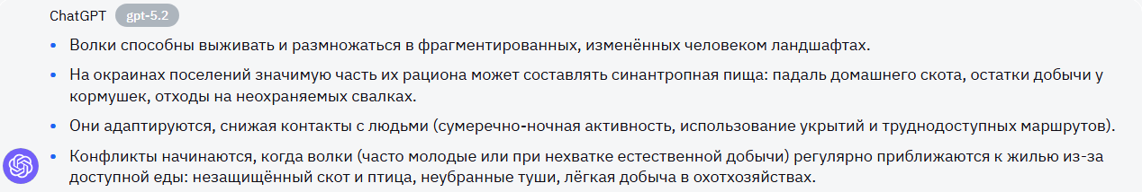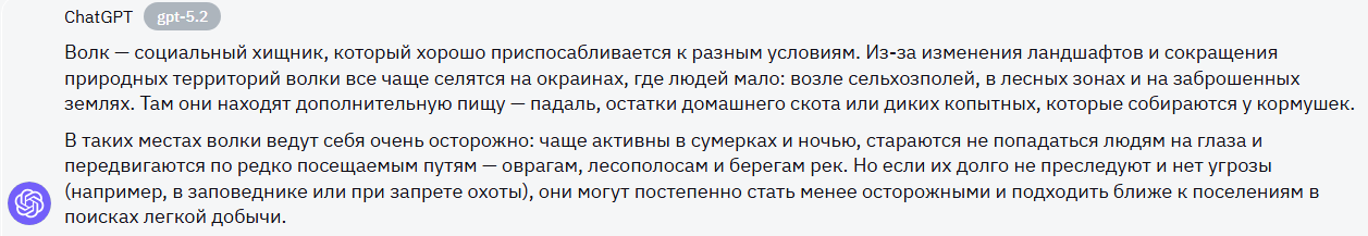 Волк - хищник, который не только выживает, но и способен успешно размножаться в условиях фрагментированных и измененных человеком ландшафтов. Исследования последних лет показывают, что значительная часть рациона волков, обитающих на окраинах сельских поселений и вблизи фермерских хозяйств, может составлять синантропная добыча: павший домашний скот, останки диких животных, концентрирующихся у кормушек, и пищевые отходы на неохраняемых свалках.
