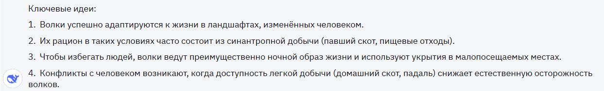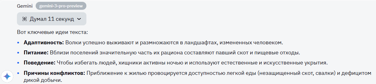 Gemini не потерял в деталях, выделил ключевые слова в каждой идее жирным шрифтом. Тут без вопросов, максимальный балл уходит в копилку модели.