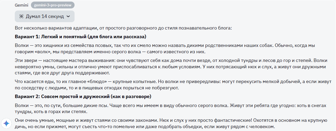 Gemini же для меня продемонстрировал более плохой результат. Упрощение можно назвать хорошим, но модель слишком сильно сократила текст. Стиль стал четким, но суховатым, потерялись некоторые факты и нюансы. Поэтому увы, но максимальной оценки Gemini не получит, только два балла.